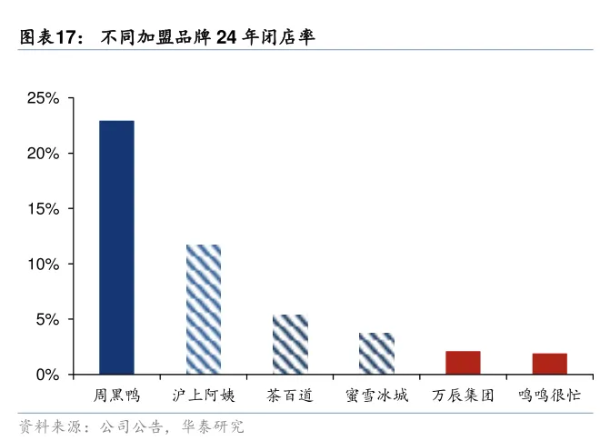 根据华泰证券的研报,以2024年为例,量贩零食品牌的闭店率要远低于奶茶、卤味等加盟品牌。