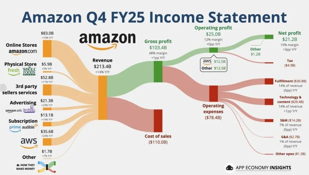 近日,亚马逊公布了截至12月31日的2025年第四季度及全年财报。数据显示,2025年第四季度,亚马逊实现营收2134亿美元,同比增长14%,这也是单季度营收规模首次突破2000亿美元大关。同期,亚马逊实现净利润212亿美元,同比增长6%,稀释后每股收益为1.95美元,略低于市场预期的1.97美元。