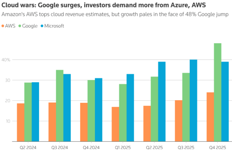 根据Synergy Research Group最新数据,2025年第四季度,亚马逊在公有云市场的市场份额约为28%,在主要云服务提供商中依然保持着领先地位。微软以21%的市场份额位居第二,谷歌市场份额约为14%,三大云服务提供商控制了公有云市场68%的份额。但从营收增速来看,AWS四季度的营收增速(24%)明显不及微软Azure(39%)和谷歌云(48%),微软Azure仍是AWS在云服务市场中一个巨大的威胁。