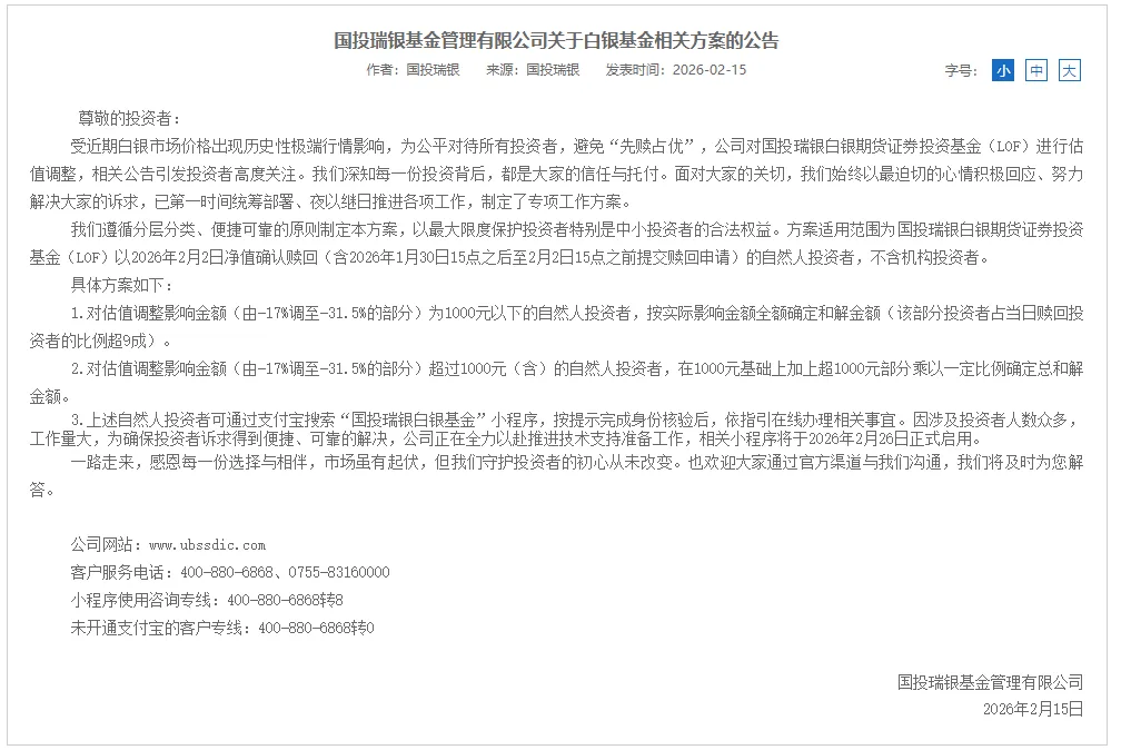 除夕是万家团圆的时间,国投瑞银白银期货(LOF)A(161226)(以下简称白银基金)对前期净值调整给出了和解方案: