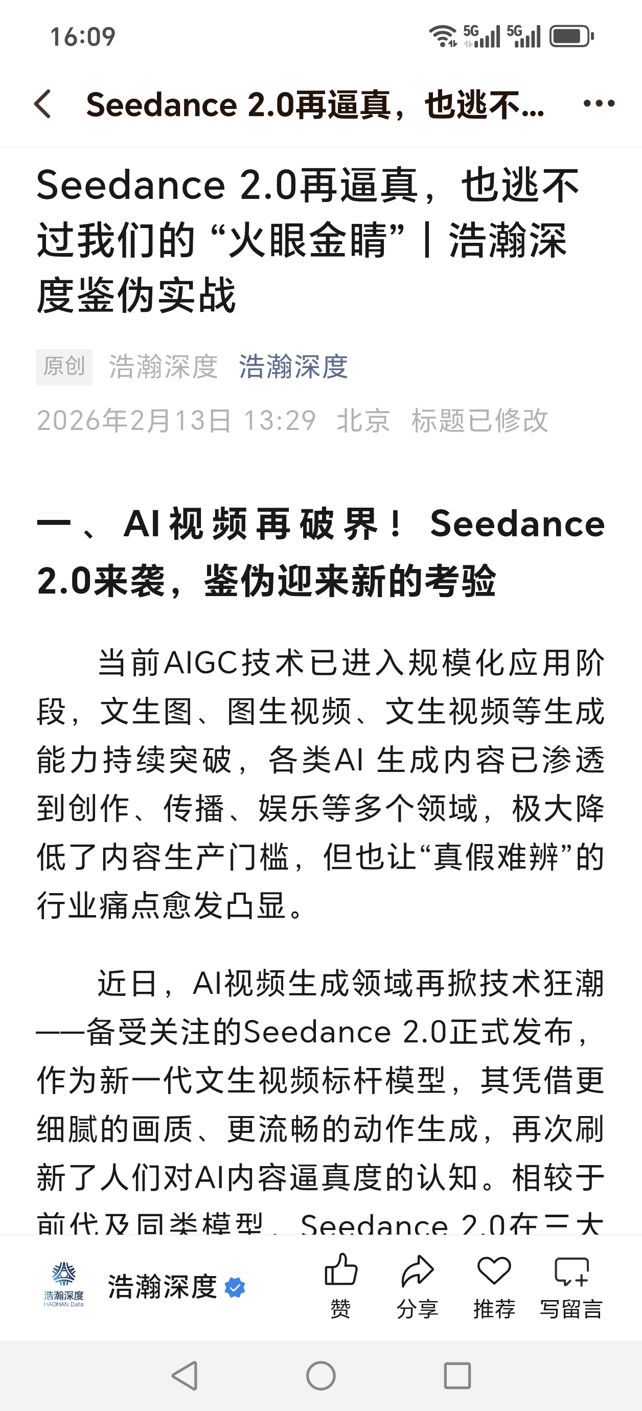 结论:Seedance 2.0的技术迭代,让“反诈”从奢侈品变成了必需品。浩瀚深度凭借其硬核的鉴伪技术和已落地的订单,正在成为这场技术变革中的核心受益者。