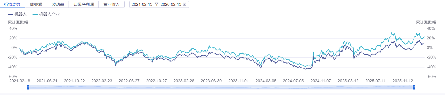 对比近五年的行情走势,国证机器人产业指数(980022.SZ)更有优势。