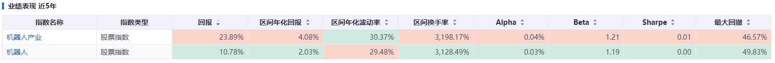 对比近五年的业绩表现,国证机器人产业指数(980022.SZ)在多个维度也更有优势。