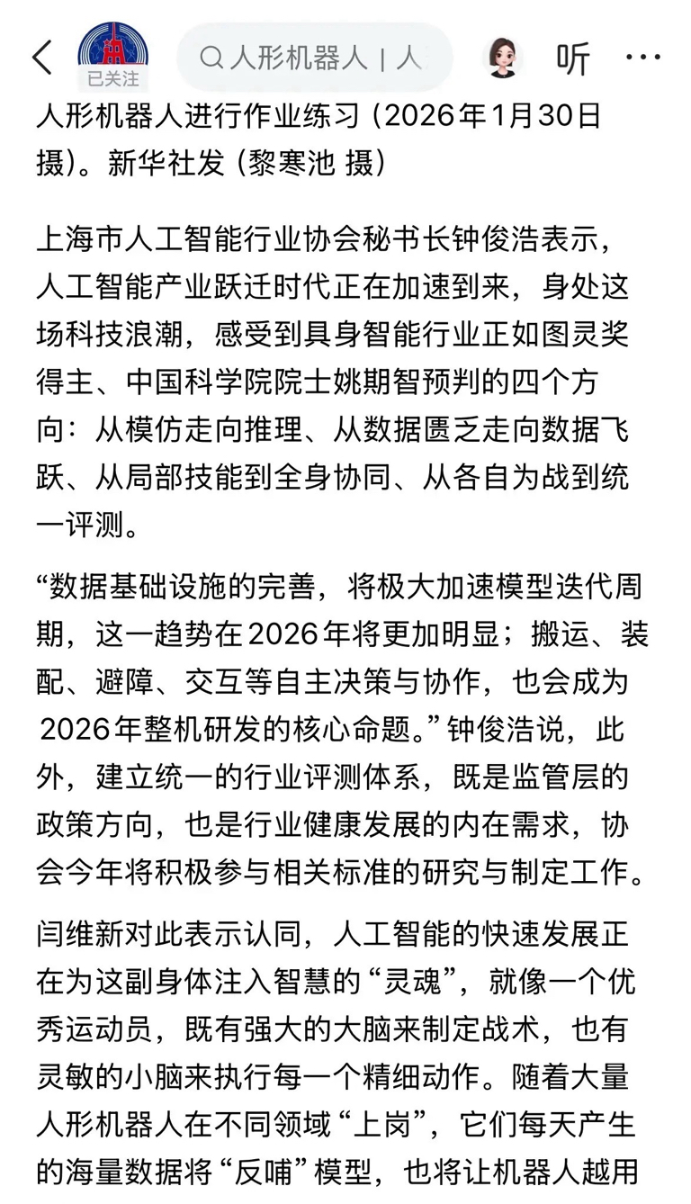整体来看,新华社这篇文章比较客观,专家也比较靠谱,是我看到的2026年关于人形机器人最靠谱和最权威的文章,值得一读。#白银涨5%#强势机会# #股市怎么看# $利亚德(SZ300296)$ $百达精工(SH603331)$ $天奇股份(SZ002009)$