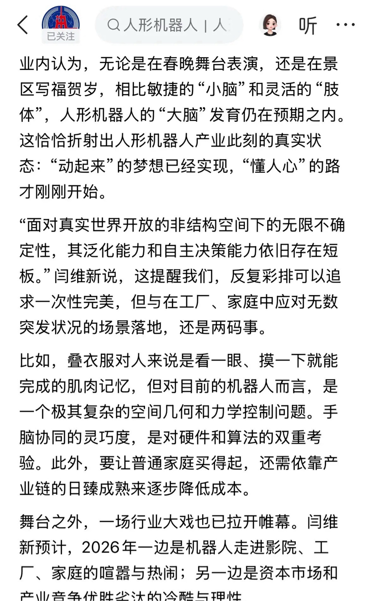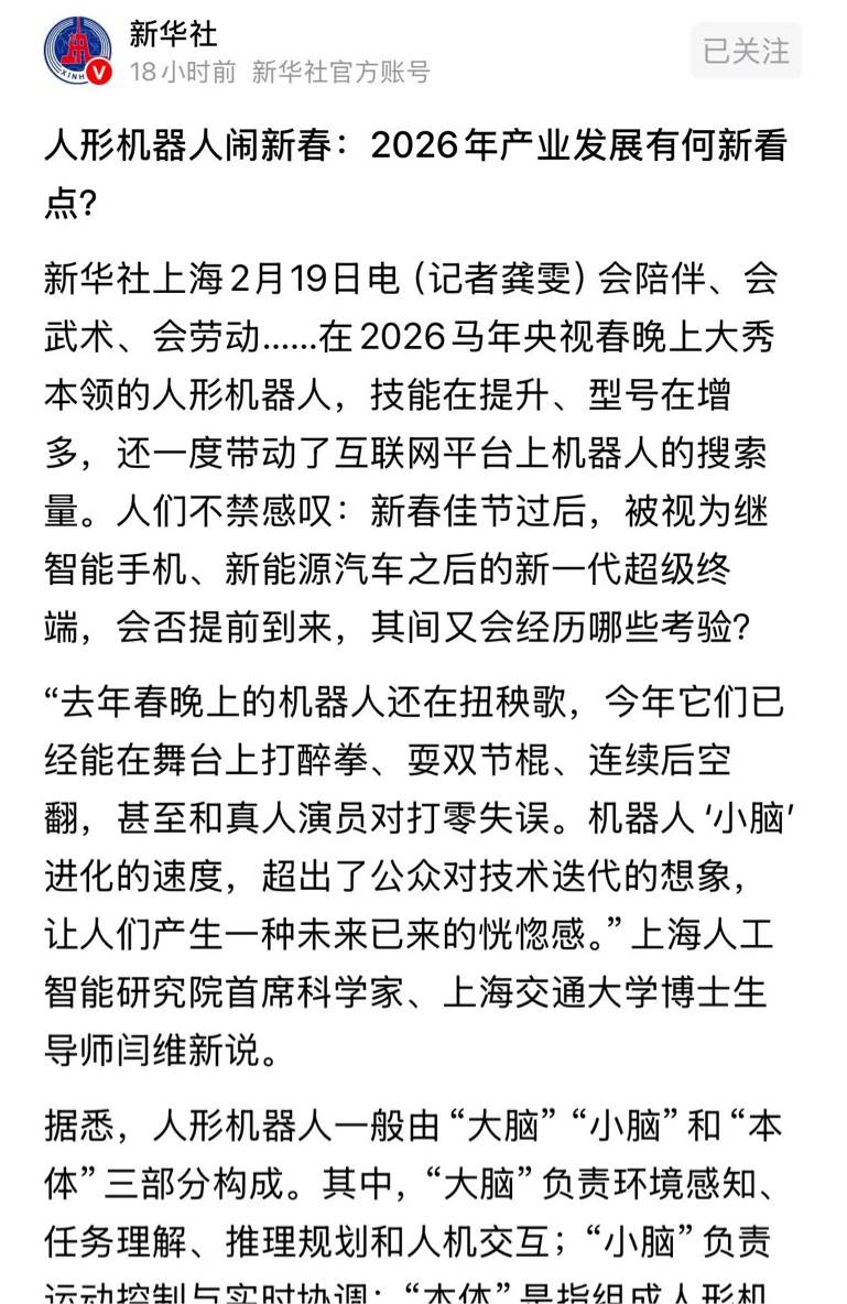 新华社发布人形机器人重磅消息,人形机器人表演与工厂家庭应用是两码事:春晚后人形机器人会爆发吗?马年大年初四,随着春节假期临近结束,2026年网上关于人形机器人的讨论热烈起来,众说纷纭。尤其是人工智能领域的两个大佬:图灵奖得主杨立坤和AI教母李飞飞出来说人形机器人是编程和遥控的,缺乏商业化落地应用场景和数据,惹得一帮买了人形机器人和看好人形机器人的网友大为不满,纷纷出来指责他们别有用心或误导中国人形机器人产业发展。那么到底真相怎么样?新华社昨天及时发布了一篇人形机器人2026年产业前景的权威文章,我给大家客观分析和翻译一下: