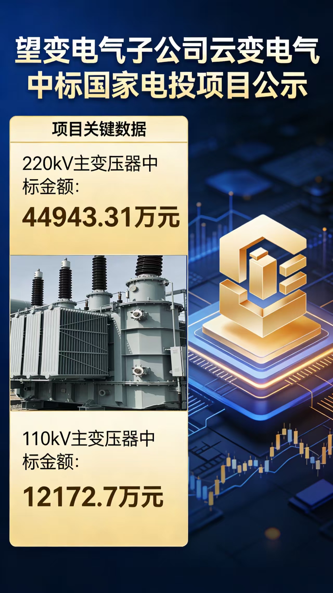 1. 220kV主变压器项目:220kV主变压器中标44943.31万元,110kV主变压器中标12172.7万元,彰显了公司在高端变压器领域的技术壁垒和市场地位。