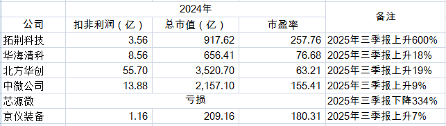 5. 可比公司有拓荆科技、华海清科、北方华创、中微公司、芯源微和京仪装备,业绩差异比较大。考到公司基本面,市盈率可以到百倍(按照扣非利润计算)。