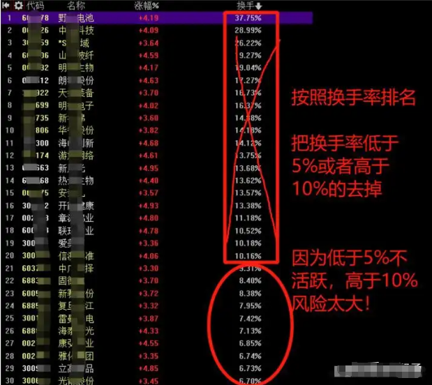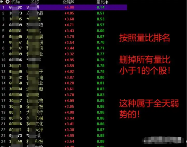 1:在14:30分左右,键盘输入60涨幅排行榜,然后回车键 2:选择涨幅在3%~5%的股票,行情不好或者更好,可以适当放宽条件,但是不要超过5%,否则太高了,性价比不高! 3:按照量比排名,删除掉所有量比小于1的个股,因为这种无成交活性的股票,都是冷门股,主力无法出货自己在玩儿。 4:按照换手率排名,把换手率低于5%和高于10%的个股删除掉! 5:按照流通盘排名,删除流通盘低于50亿,高于100亿的个股! 6:剩下的股票,点击去一个一个看,留下成交量持续放大的个股。 7:看K线图的均线,短期是没有压力的,或者还有空间的! 8:在分时图鼠标右键单击,叠加“上证指数”分时图,观察股价,必须强于大盘分时图,强于股价均线! 9:在尾盘14:30分后,均价线必须创新高之后,开始回踩均线!