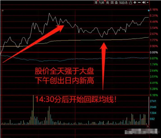 1:股价需要创全天分时图的新高,而且放量! 2:K线的均线呈多头排列,最近3天内出现过阳线拉升。 3:MACD指标处于0轴的上方。 4:量能均价线处于金叉区域! 5:分时图要强于大盘的分时图,大盘下跌个股横盘,大盘横盘个股上涨,大盘上涨个股大涨!