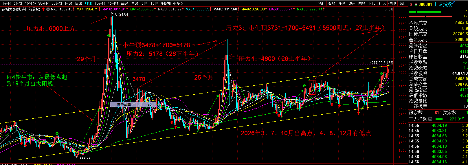 前面帖子说过,主力拉涨是有目标任务的。上证大盘这轮牛市上涨的基本目标任务是4612附近;2026年涨到2015年那轮牛市顶点5178附近的4800—5270区间就是超额完成任务;如果能够站稳5270上方即大盘翻倍,主力上攻5500—6134就是意外惊喜,不过2026年突破5500的概率极低。