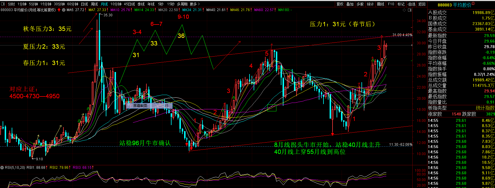 平均股价:目前上涨形态。29元是强支撑,春末夏初回踩29元可大胆加仓。上攻31—32元是强阻力,到达要大幅减仓。平均股价不见顶,多数指数、板块和个股仍有上涨机会。但平均股价涨到32元后,由于主力会乘机抛售逃跑,很多板块和个股就不会涨了。