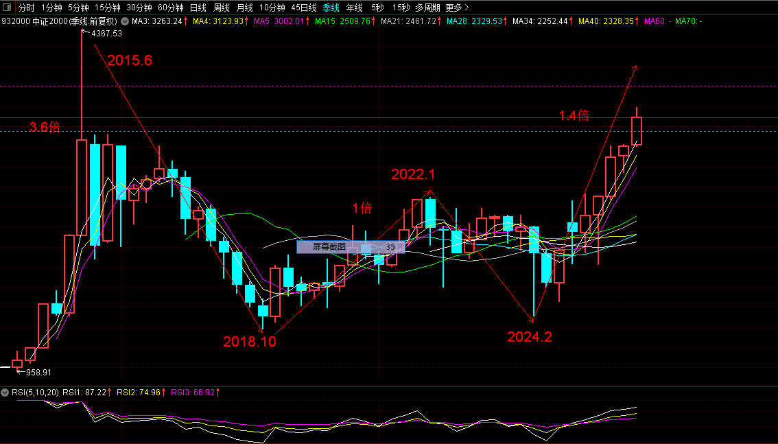 中证2000:跟随上证突破了2021年的高点,但离2015年牛市最高点4367还有距离。上证不见顶,中证2000仍有上涨机会。但3800附近有阻力。如果站稳3800,有可能上攻2015年的高点4367附近。