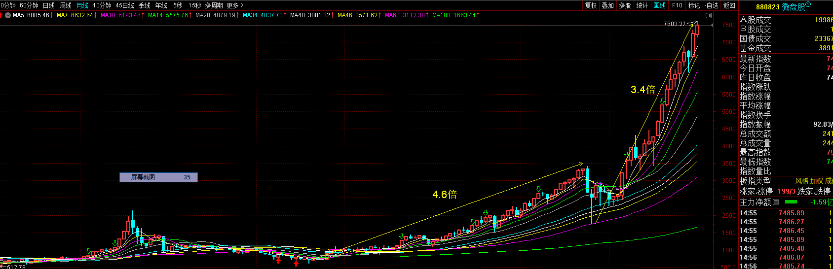 近两轮牛市先锋或旗手是微盘股指数。上轮牛市涨了4.6倍,目前涨幅3.4倍,上涨形态良好,涨幅到达4倍是大概率。今后牛市结束的信号是月线收盘在6566下方。只要在6567上方,主力仍会抱团拉涨。