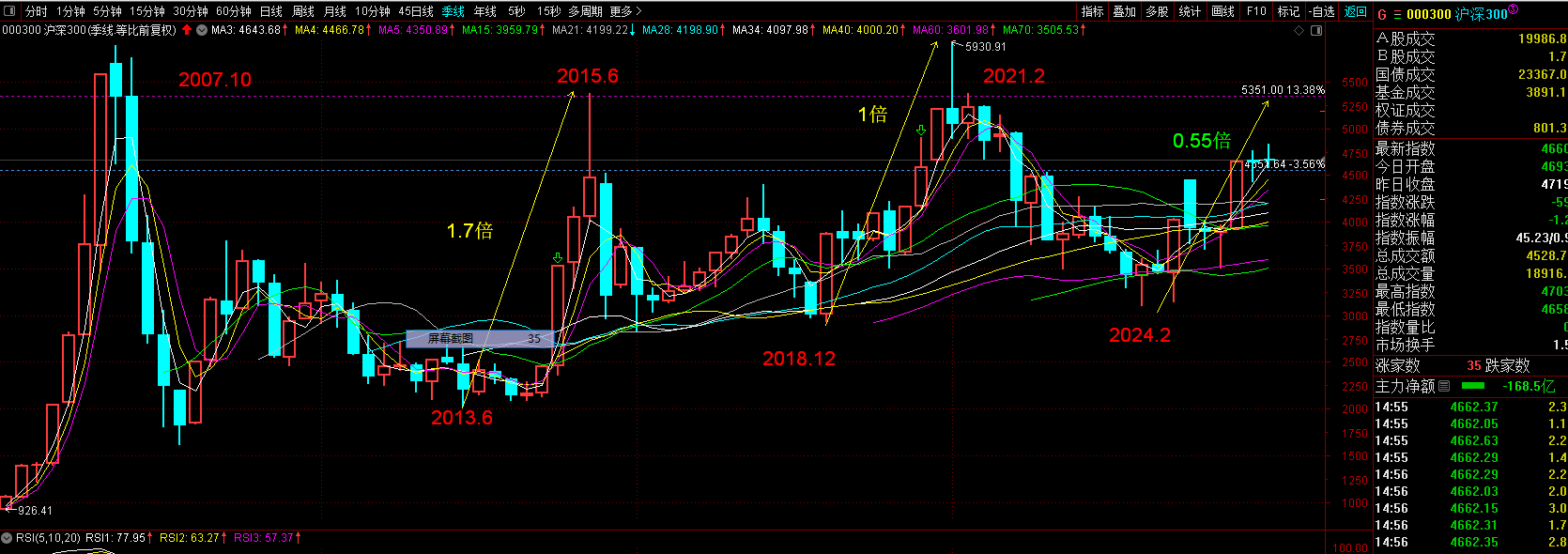 沪深300指数,这轮牛市涨幅落后微盘股、中证2000、北证50、创业板和科创板等指数。原因是上轮牛市,上证、中证2000、创业板等都没有超越2007年或2015年牛市的高点,股价处于低位吸引主力资金买入,这轮牛市要补涨,即主力资金会高低切换。而沪深300、上证50上轮牛市,不仅仅超越了2015年牛市顶点,而且攻破了2007年牛市最高点,主力在4年前已经提前完成创新高的目标任务,这轮牛市已经没有接盘拉涨的兴趣。但今后涨到5350点是大概率。