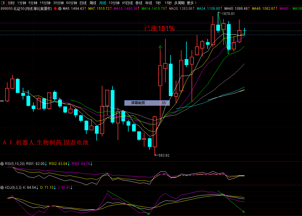 北证50:这轮牛市涨幅181%,接近2倍,目前处于筑顶阶段。北证50的市盈率高达69倍,由于个股业绩不佳股价透支了未来,上涨乏力,一旦涨幅到达2倍后就会进入诱多阶段,跑为上策。现价1529点,今后月线收盘在1618上方,才能化解筑顶形态。相反,如果月线收盘在1387下方,牛市就会结束,今后熊途漫漫,会折腾几年跌破800点。