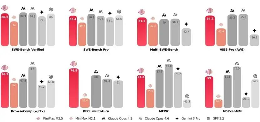 M2.5 在编程、工具调用和搜索、办公等生产力场景都达到或者刷新了行业的 SOTA,比如 SWE-Bench Verified (80.2%),Multi-SWE-Bench (51.3%),BrowseComp (76.3%);