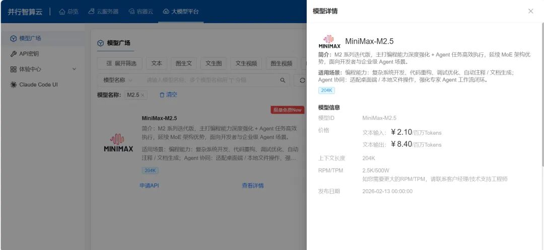 2月13日,稀宇科技发布了其最新一代旗舰模型MiniMax M2.5,并行科技MaaS平台当天即完成模型部署,现已开放体验,点击链接即可调用:https://ai.paratera.com/#/lms/model。