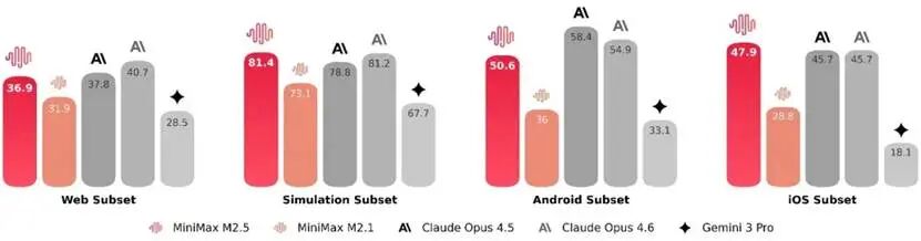 为了衡量相关能力,VIBE 基准升级为了更复杂、更具挑战性的 Pro 版:显著提升了任务复杂度、领域覆盖度和评估准确度。综合来看,M2.5 与 Opus4.5 表现相当。