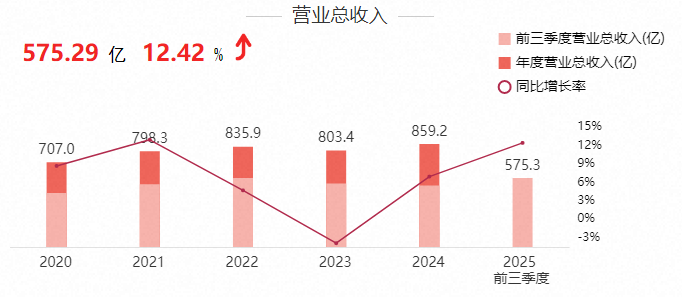 2025年前三季度,公司实现营业收入575.29亿元,同比增长12.42%,