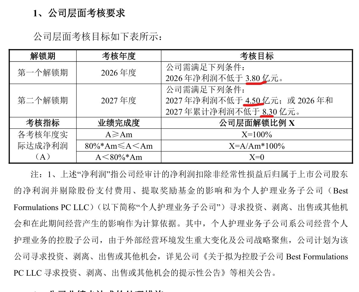 仙乐健康业绩考核目标设定为2026年、2027年、2028年营业收入分别不低于50.90亿元、53.83亿元和58.32亿元。