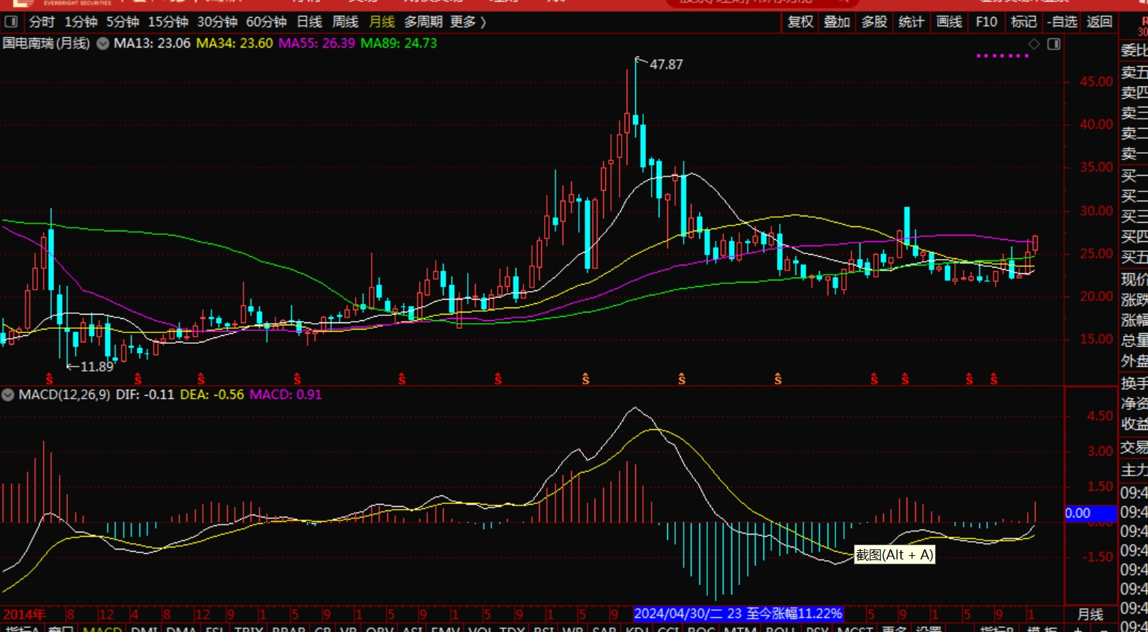 如果再看国电南瑞的月线图,我觉得这是走势最完美的月线图,是走到临界点的月线走势。