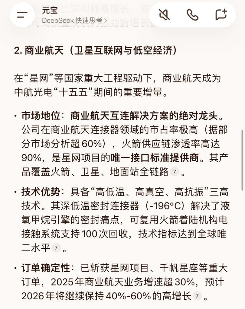 订单确定性:已斩获星网项目、千帆星座等重大订单,2025年商业航天业务增速超30%,预计2026年将继续保持40%-60%的高增长。