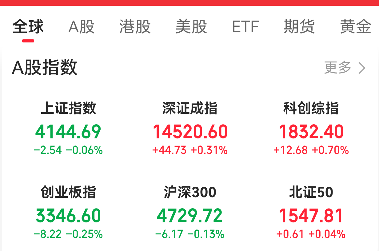 截至发文, 上证指数下跌0.06%,报4144点;深证成指上涨0.31%,报14520点;创业板指下跌0.25%,报3346点。
