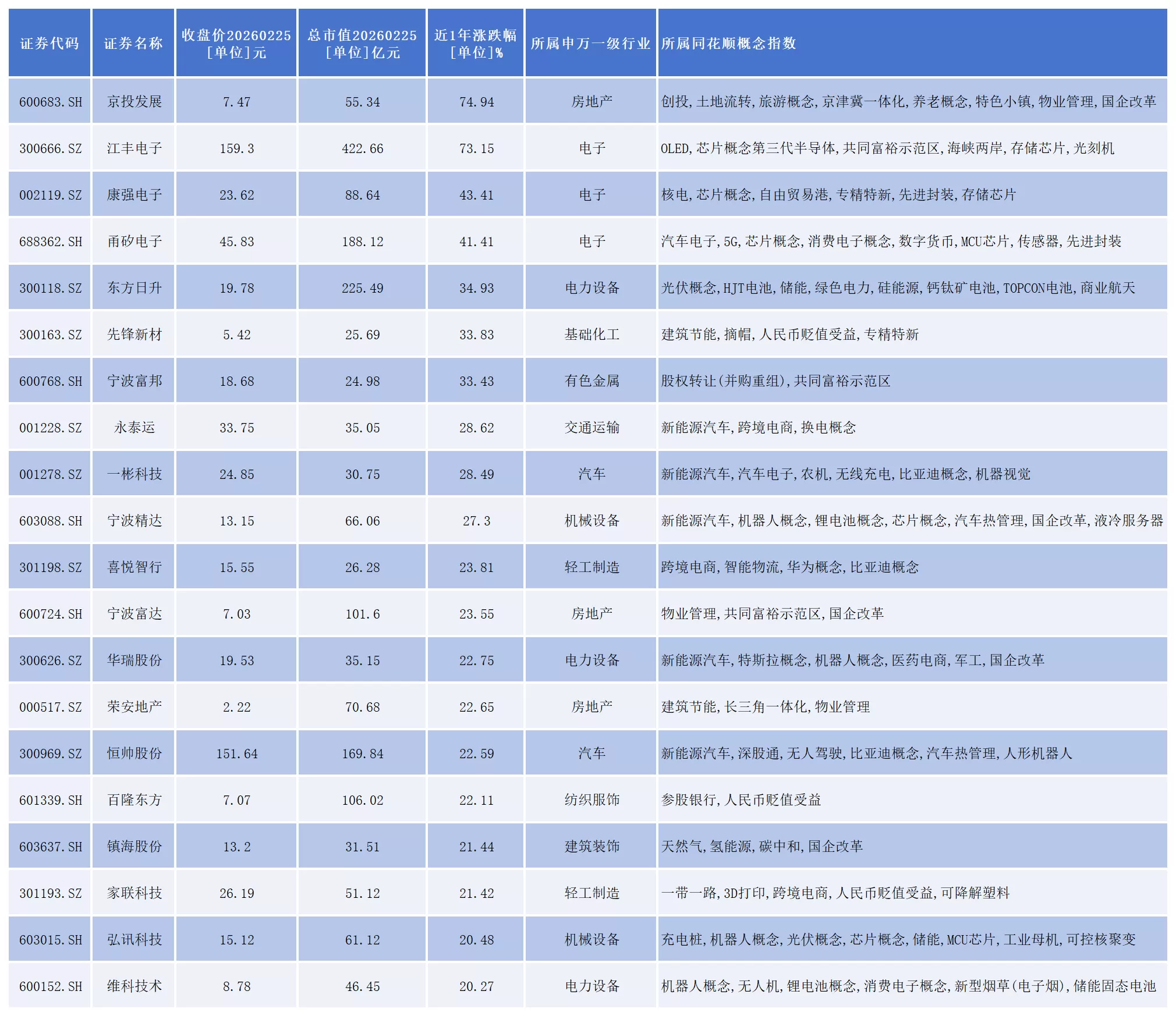 从2026年以来表现看,京投发展(600683.SH)、江丰电子(300666.SZ)、康强电子(002119.SZ)、甬矽电子(688362.SH)、东方日升(300118.SZ)、宁波精达(603088.SH)、$喜悦智行(SZ301198)$等20家公司涨幅超过20%。
