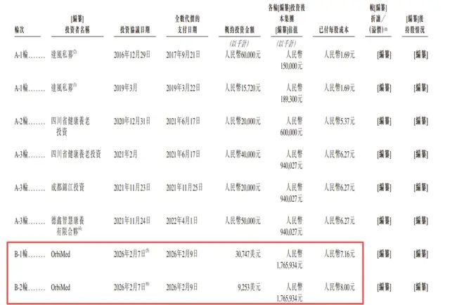 就在递交上市申请前夕,锦欣康养于2025年2月9日完成了B-1和B-2轮融资,合计融资金额为4000万美元,投资方为OrbiMed。据招股书显示,此轮投资后,公司估值达17.66亿元。