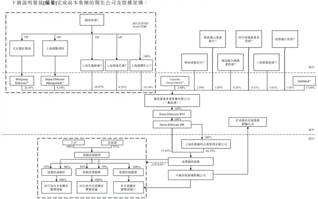 股权结构方面,锦欣康养的控制权高度集中于核心团队及员工持股平台。招股书显示,锦欣投资通过Hongxing Eldercare、Jinjun Eldercare Management等多家实体,合计控制公司约68.60%的股权。而锦欣投资由199名锦欣集团前任或现任雇员通过锦欣控股实体实益拥有。