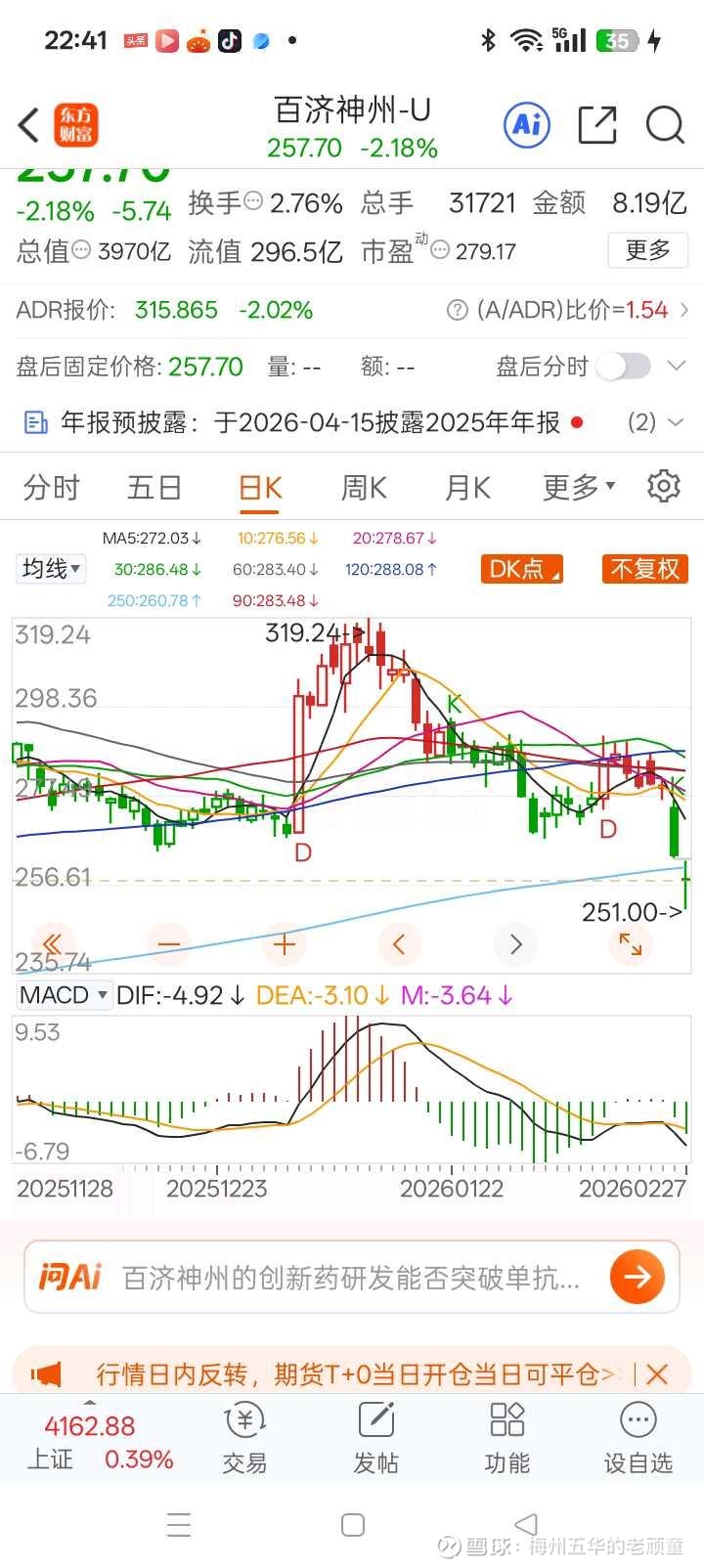 今天,三个我心目中的创新药龙头的业绩预告后的走势,让我对创新药看多情绪一度产生了怀疑。是我错了,还是市扬错了。看创新药名副其实的龙头百济神州,今年382亿的营业额,是纯创新药股票的一哥无疑,而业绩也是从去年亏损到今年的每股达到质优股行例的一股一元的收益,在如此利好公告前后,连续几天下跌(其过程中还有大跌)。虽然可以说其市盈率还是有点偏高,下跌也有一点道理。如图