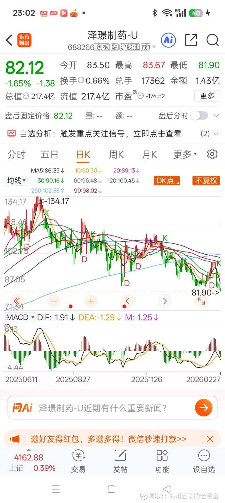本来,艾力斯的下跌说是利好出尽的话,泽璟制药就应该是利空出尽是利好,股票价格应该上涨才是,这其中有大A投资者的喜好,越亏越炒,但泽璟也不按常理出牌,股票价格也是不涨反跌,而且是大跌。业绩最优的跌,营业额大增,扭亏为盈进入质优行例的也跌,菅业额大增业绩不增反减的同样是大跌,试问,其它创新药股价何德何能能比他们更优秀呢?在它们的走势中,我知道创新药还没有见到长期底部。抱着君子不立危墙之下的态度,我今天把买入后从未卖出过的持仓海创药业卖出了5分之3,不是因为不看好创新药,而是现在看不明白,所以决定部分资金先移到前年9月23号指数在2748点就己在11元,现在指数在4162点了,股价却在10.67元的浙商证券之中来,业绩比23年大增近百分之五十,又落后大盘指数超过1312点,就算今后不能大涨,但最少己无多少向下空间了。如图