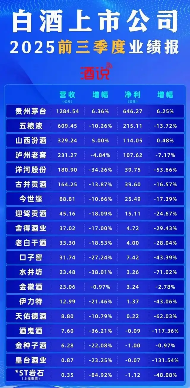 翻开2025年白酒三季报,一幅清晰的“冰火分化图”跃然纸上。行业龙头贵州茅台前三季度营收1309.04亿元,归母净利润646.27亿元,依然保持着6%左右的增长,其净利润甚至超过了五粮液、汾酒、老窖、洋河四家之和。然而,这“增长”背后是自2015年以来最低的增速,第三季度营收增速更是降至不足0.5%,创下多年新低。茅台这艘巨轮虽未倾覆,但航速已明显放缓。