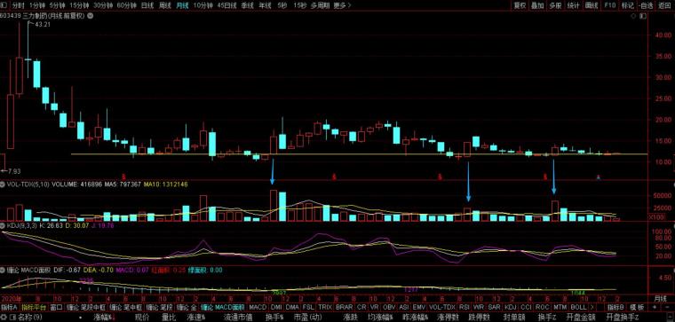 2.当前再次跌回到12附近,K柱变小,说明波动不大,筹码稳定。