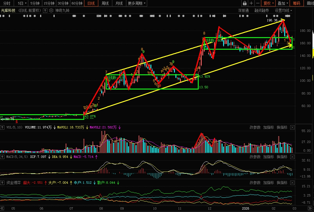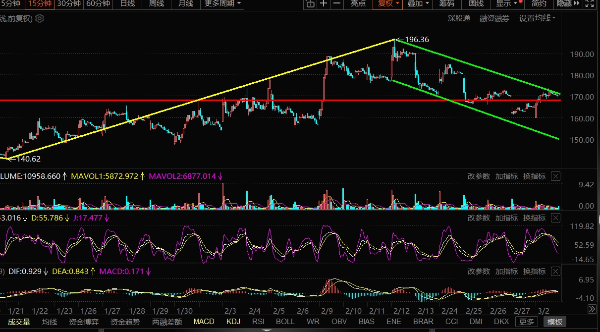 $光库科技(SZ300620)$ 今日白天从长期日线图分析了从50块钱到196块钱以来的上升通道图的结构,日线上今天受通道底部160的支撑出现反弹。但下午又受到短期15分钟K线图下降通道的压制,如下图