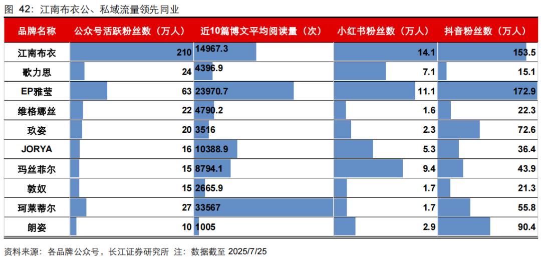经过多年运营,江南布衣的全渠道流量在行业中保持领先。长江证券研报显示,截至2025年7月,公司的公众号活跃粉丝数达210万人,小红书粉丝数为14.1万人,抖音粉丝数达153.5万人,均在同业中处于领先地位。