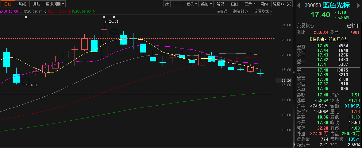 那个股东减持,就是短期个人行为,到现在也没再发新的减持公告,所以抛压应该会慢慢变小,再说减持也不会影响公司本身的价值。昨天股价大跌纯粹是市场反应过度了,AI营销这个赛道长远看是有前景的,昨天板块大跌也就是些赚到钱的人套现跑了,后面会慢慢稳住,蓝标作为龙头肯定也会跟着好起来。所以今天就看昨天的低点17.2附近能不能撑住,要是能稳住,可以加点仓,冲高的时候做个T。我也与各位战友共进退。
