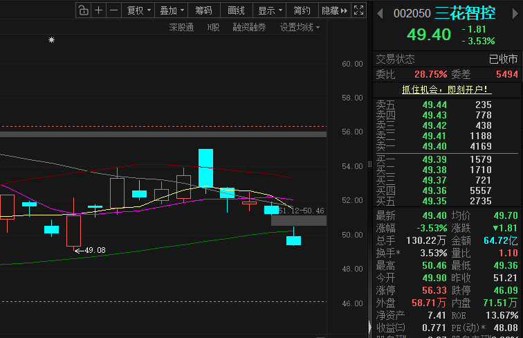 昨天跟着家电和汽车零部件板块一起跌了,热管理这块也不太行。作为龙头股,它走势本来就容易跟着板块走。今天如果反弹能涨回50.46那块缺口并且站稳,我就先拿着看看情况。要是站不稳,趁着反弹就分批卖掉算了,别老想着等更高点,毕竟大资金跑路迹象挺明显的。如果直接跌穿49块这个关口,也别犹豫,赶紧走人。股市嘛,有赚有亏很正常,来来回回都是这样。