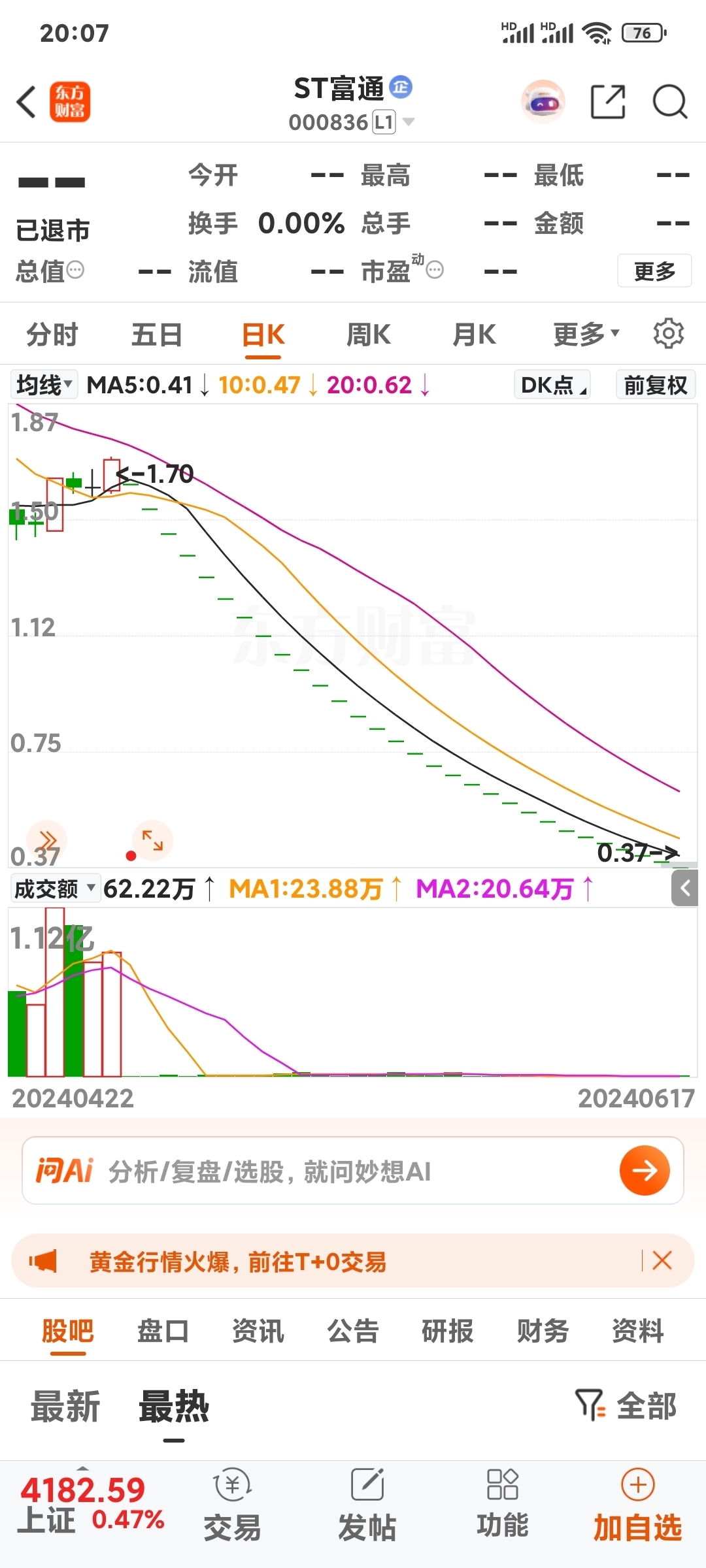 - 基本面:即便每股净资产0.59元,市净率低至0.63,在退市预期与流动性枯竭面前,估值支撑完全失效。