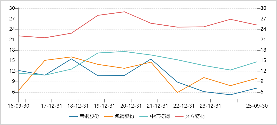 2021年三季度到2025年三季度,宝钢股份、包钢股份的营收年复合增速均为个位数负值,净利润增速更是大幅下滑(宝钢-22%,包钢-50%),包钢还出现过两年亏损。
