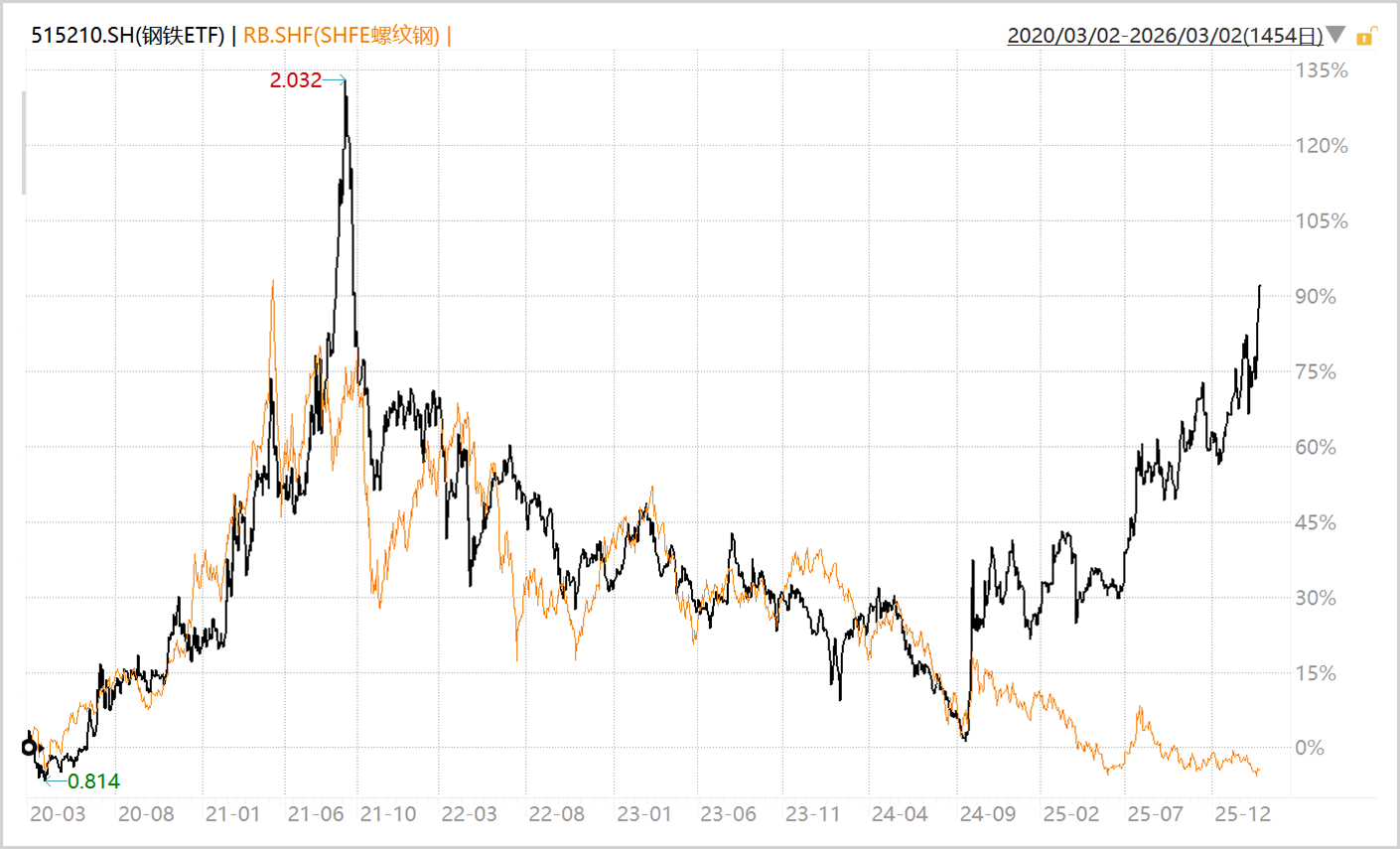 过去多年,A股钢铁板块与螺纹钢价格走势高度同频。但从2024年9月开始,两者却罕见地分道扬镳——钢铁板块一路高歌,累计涨幅超过80%,一举回到2021年10月的高位水平。而螺纹钢价格却仍在3000元/吨附近徘徊,处于近十年来的底部区域。