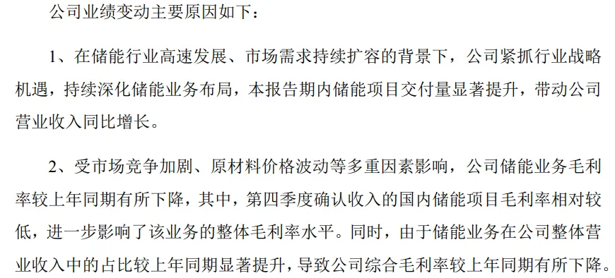 对此,公司给出的解释是,受市场竞争加剧、原材料价格波动等因素影响,储能业务毛利率有所下降。特别是第四季度确认收入的国内储能项目毛利率较低。