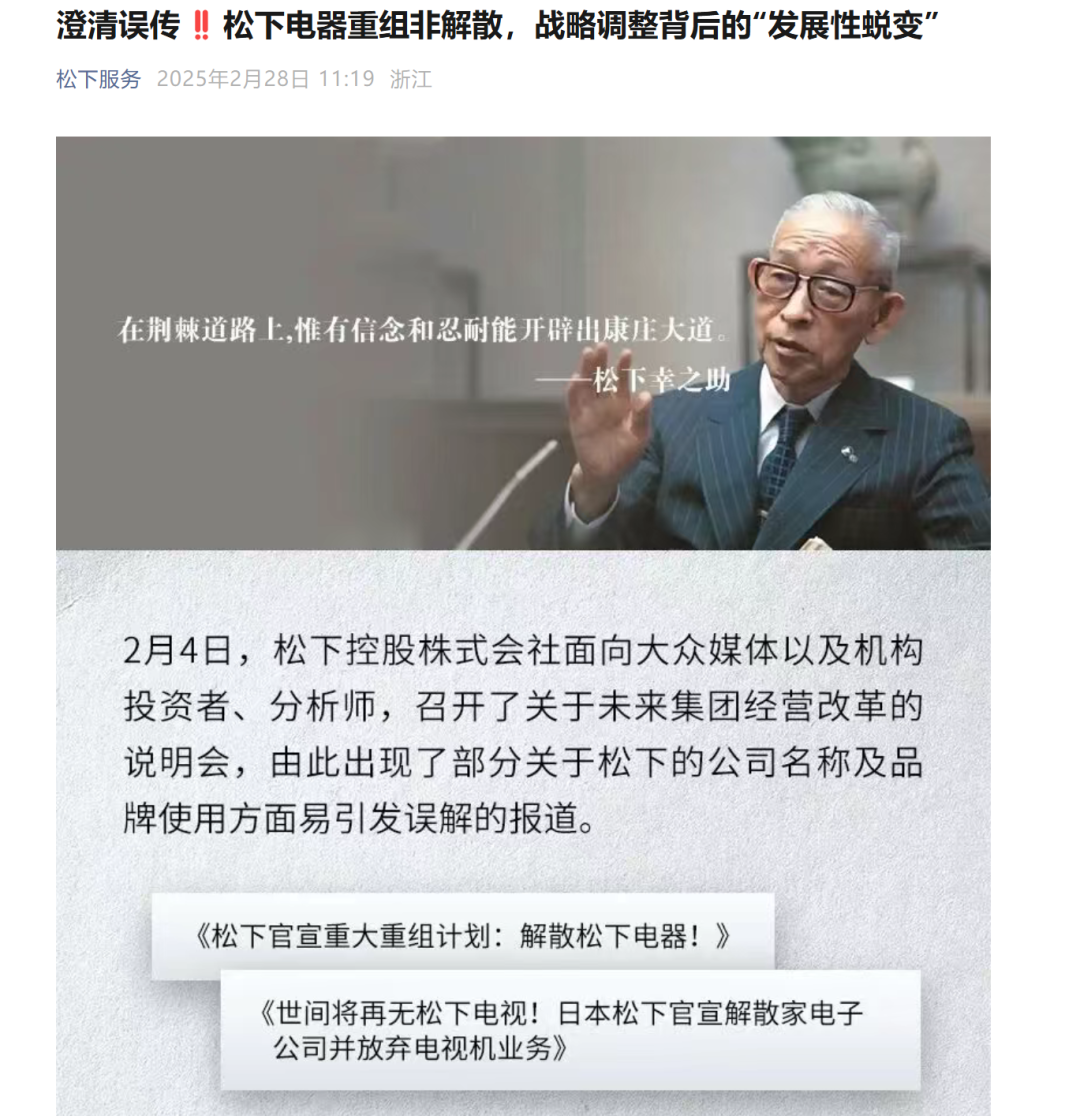 尽管在舆论发酵不久后,松下很快就又发布了一则澄清公告,称“解散”实为“重组”,且公司对于电视机业务的出售或退出尚未做出任何决定。