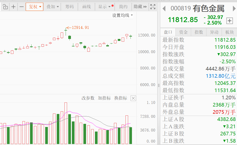 有色金属-2.50%,昨天老哈T了小20w仓位,其中不少是有色,也是避开今天少许调整。午后看情况,趁调整,老哈准备把昨天精简的有色仓位,分批合并补到1只,然后蹲下一波回升了。