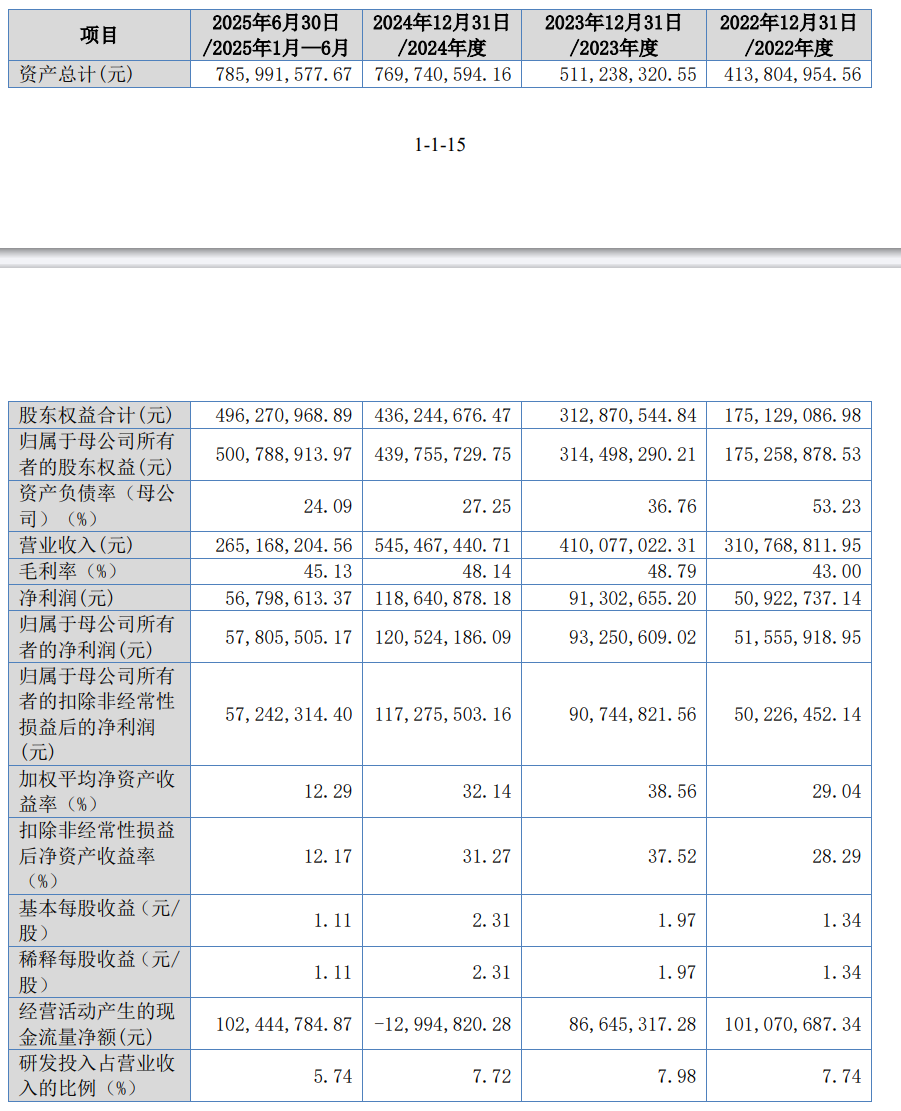 报告期内(2022年至2025年上半年),锐翔智能的营业收入分别为3.11亿元、4.1亿元、5.45亿元、2.65亿元;净利润分别为5092.27万元、9130.27万元、1.19亿元、5679.86万元。