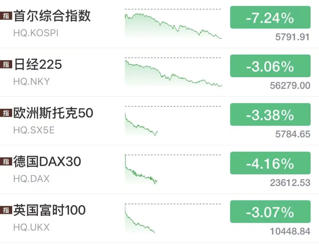 日经225指数大跌3%,韩国KOSPI指数暴跌7.2%,欧洲股市下午开盘集体扑街,普跌3%以上,纳指期货下跌2%。