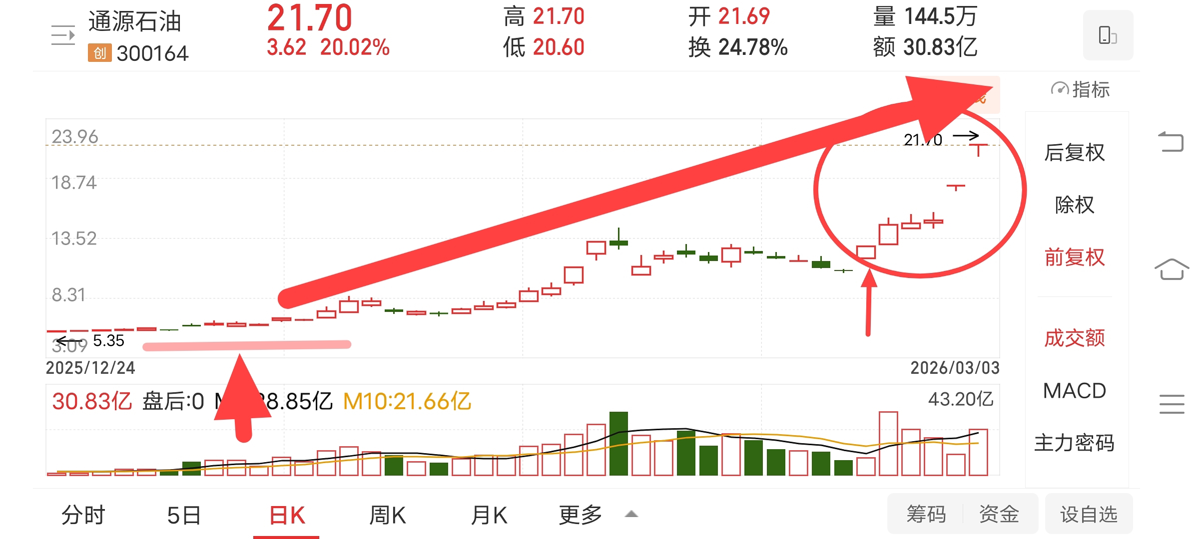 如果说蛇年第一帖的大位科技翻倍用了十几个交易日,今年的通源石油复利翻倍只用了短短的6个交易日。