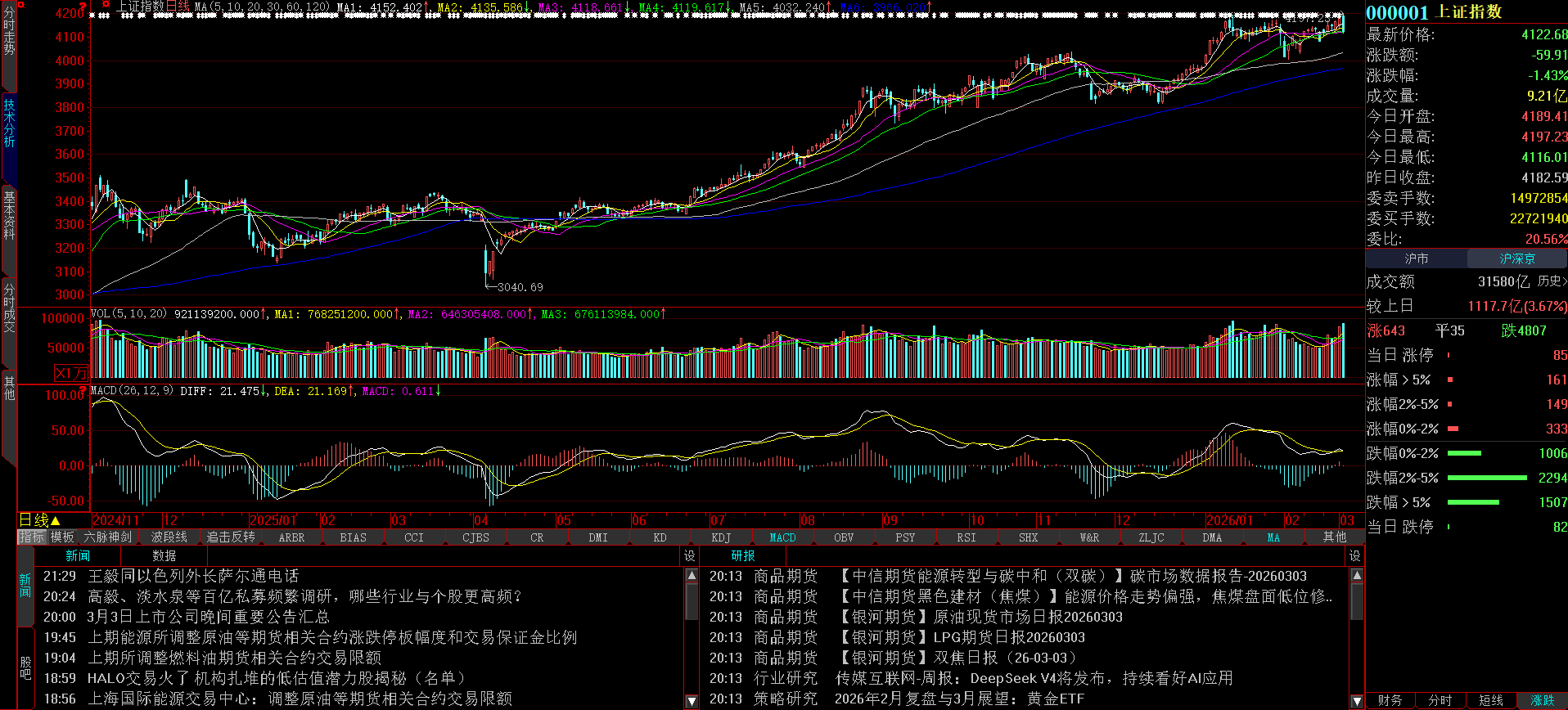 3月份2个交易日,受外周末围因素影响,A股本周第一天沪指涨其他指数皆跌,个股超4200家下跌,2000多家个股跌幅超过3%;第二天沪指一度创新高,但其他所有指数皆下跌,最终沪指也不能独善其身,个股超过4800家下跌,其中近1600家跌幅超过5%,平均股价下跌4%,仅次于去年4月7日,图形上形成高位长阴。