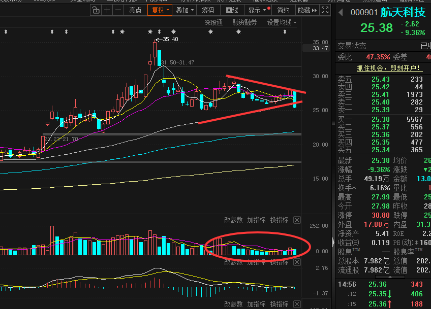 昨日平开后,股价持续呈现弱势下行,尾盘更是来到9.36%,临近跌停。虽然如此,但在回调过程中量能并没有出现放大,这也就意味整体恐慌偏弱。如此回调很大概率会是浮动筹码出逃。当然看涨动能也没有回升。