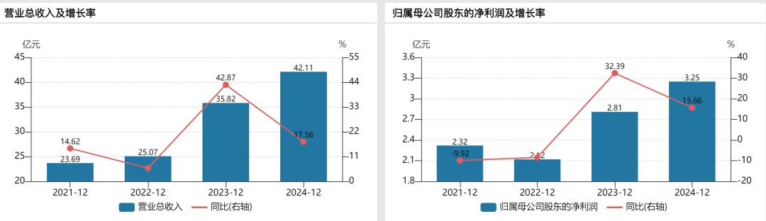 从业绩来看,2021年至2024年,公司收入持续增长,由2021年的23.7亿元增长至2024年的42亿元,四年间规模近乎翻倍。
